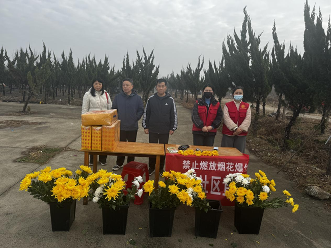 冬至祭扫高峰时段,社区协同公安部门充实值守力量,通过发放《冬至文明祭扫倡议书》引导群众错峰祭扫,同步开展“鲜花换纸钱”活动,倡导鲜花祭扫、鞠躬缅怀等简约环保方式。此外,社区还依托公开栏展示、流动小喇叭播报、悬挂宣传横幅等形式,广泛宣传文明祭扫、生态安葬理念及禁燃禁放规定,全力营造“文明祭扫、安全祭扫”的良好氛围。