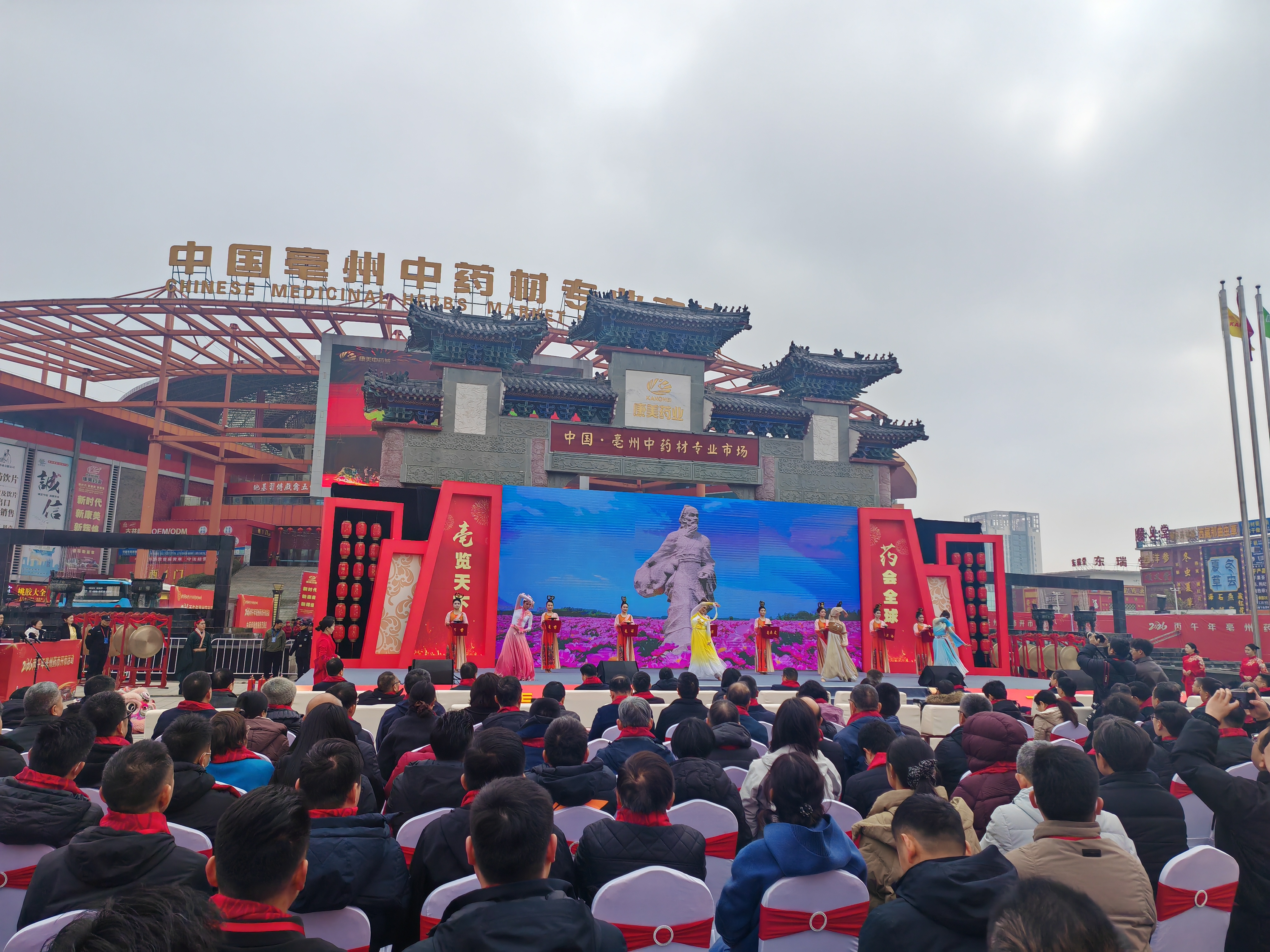 开市大典暖场阶段,舞龙舞狮、五禽戏等民俗表演轮番上演,17个中药材专业市场恭贺宣传视频同步播放,尽显全国中医药产业同心聚力的发展氛围。在庄严肃穆的“颂迎华佗”环节,通过致颂词等四大亳药仪式,深切传承华佗中医药文化精髓。