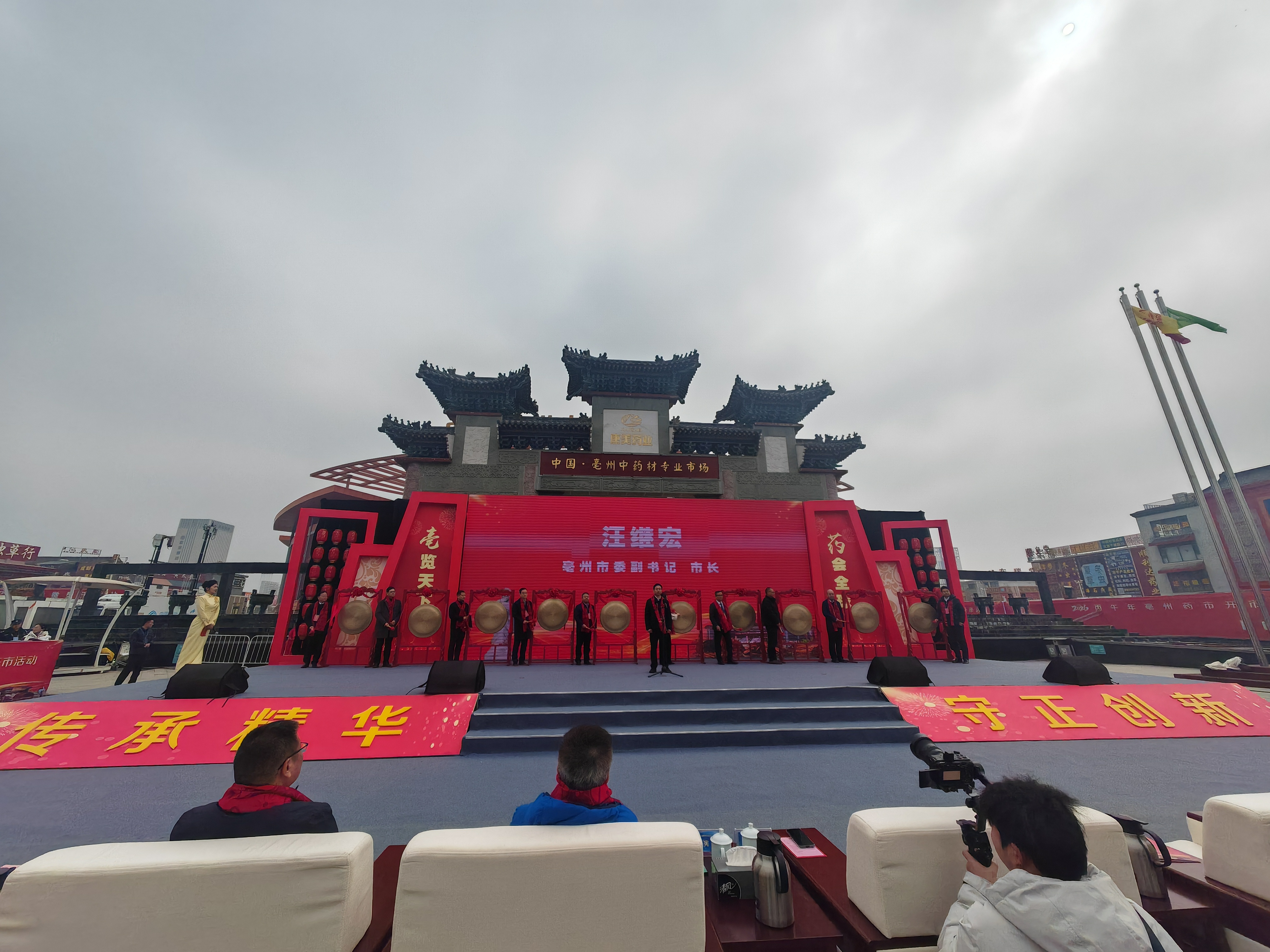在开市典礼环节,与会行业领导、企业代表先后致辞,共话中医药产业发展机遇,共谋合作发展新篇章。活动现场,亳州市政府与贵州省中医药管理局、贵州中医药大学签订合作框架协议,全国老药工传承工作室传承基地揭牌,药商代表庄严宣誓“亳商精神”。亳州市委副书记、市长汪继宏宣布开市,十位行业代表同时鸣锣,正式启动开市仪式。