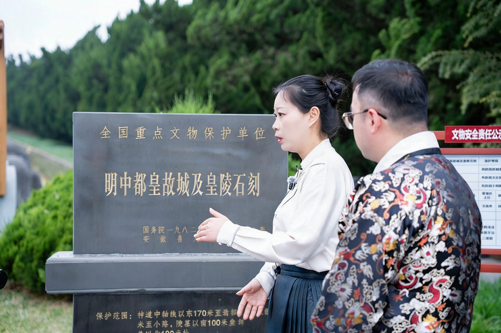 直播中,三位讲师围绕明皇陵的历史背景与文化价值,从陵寝朝向、整体格局到神道石刻艺术进行了系统讲解,重点解读了大明皇陵碑文所承载的历史信息与精神内涵。在无字碑前,讲解员张云面向数十万网友,现场声情并茂地背诵皇陵碑文,将观众带入历史情境之中,让人仿佛“梦回大明”,真切感受到朱元璋波澜壮阔的一生,以及其以孝治天下的深厚情怀。