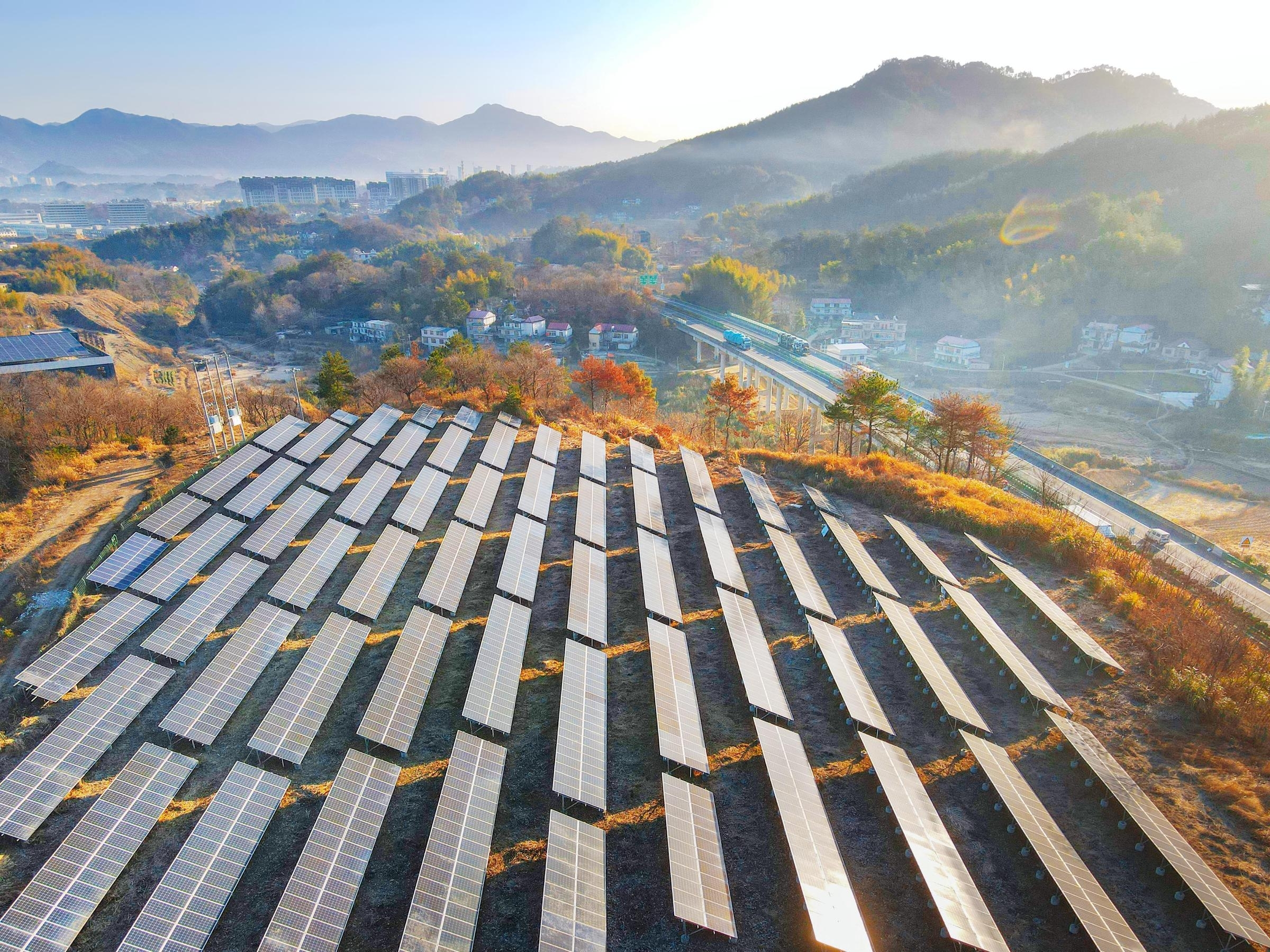 在岳西县一处荒坡上,一排排光伏发电板与民居、山峦交相辉映,勾勒出一幅和美乡村发展新画卷。