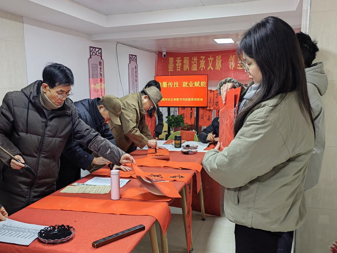 本次活动打破传统帮扶模式,巧妙将喜迎新春的写春联活动与实用技能培训相结合。社区特别邀请四位功底深厚的书法爱好者担任授课老师,从最基础的执笔、运笔方法讲起,耐心示范点、横、竖、撇、捺等基本笔画,逐步引导学员掌握楷书、行书的书写结构与章法布局。培训围绕春联、福字等节庆实用内容展开,课堂氛围热烈,学员们认真临摹,老师逐一指导,在墨香中不仅学习了书法技艺,更陶冶了情操,提升了审美与专注力。