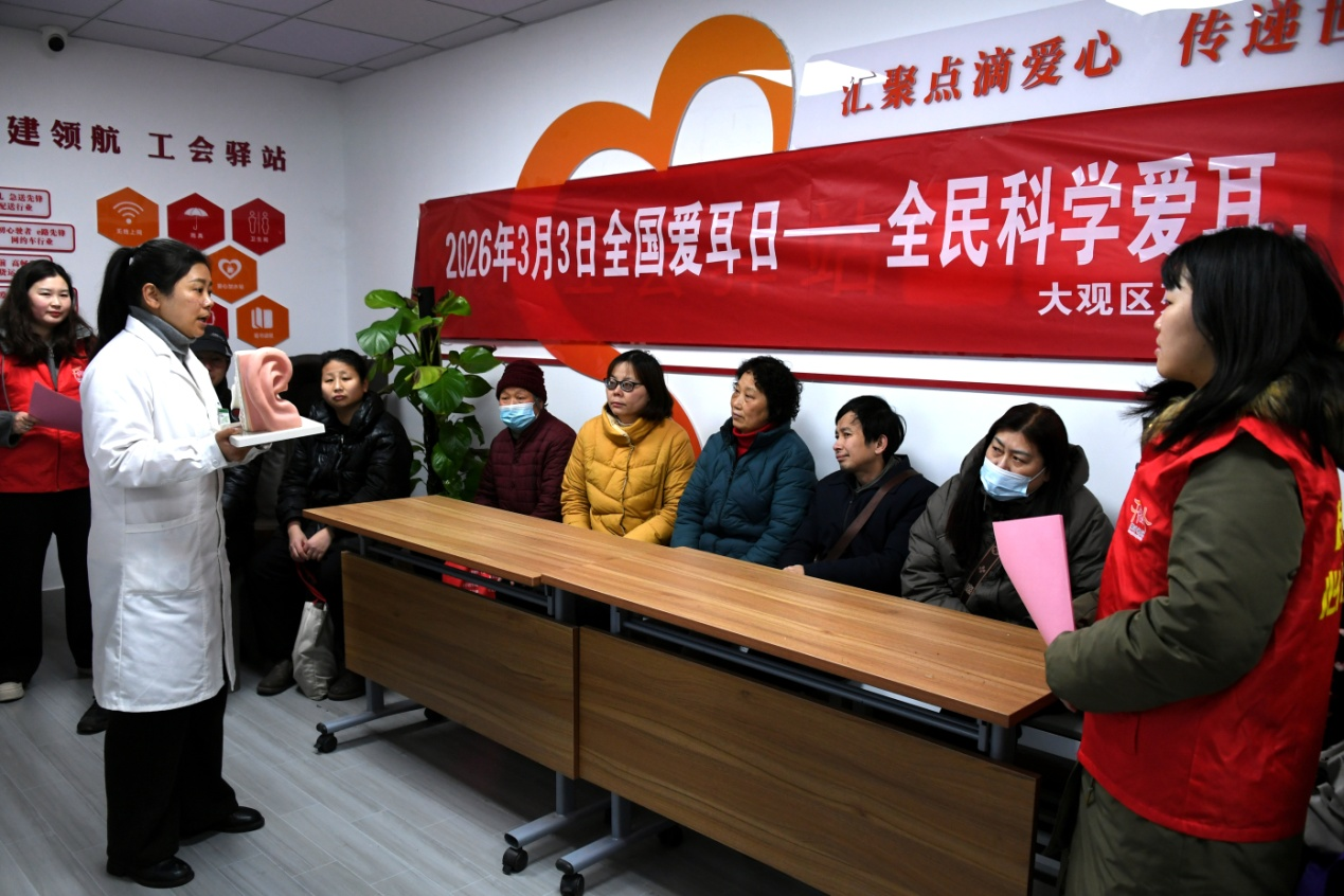 当日是第27个全国爱耳日,安徽省安庆市大观区残联,会同荣升社区开展以“全民科学爱耳,共护听力健康”为主题的“爱耳日”义诊活动。活动现场,专业医护人员向社区居民面对面宣讲科学用耳,保护听力科普知识。并现场为居民免费耳镜检查、免费听力检测,提高居民爱耳、护耳意识。 (项顺平)