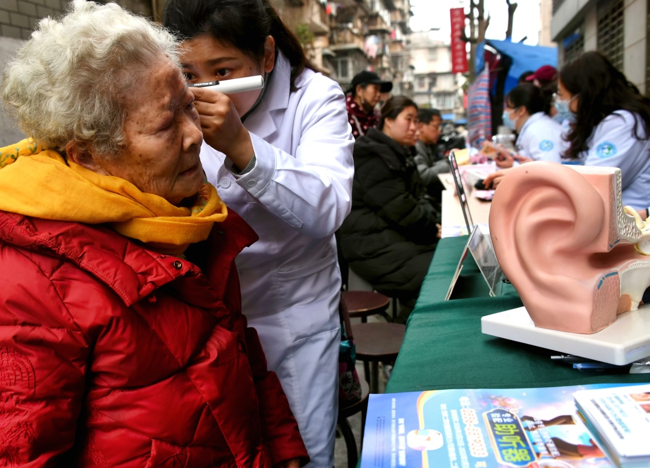 2026年3月3日,在安徽安庆大观区北正街小区党群服务驿站,医务工作者在为居民进行听力检测和听障筛查。