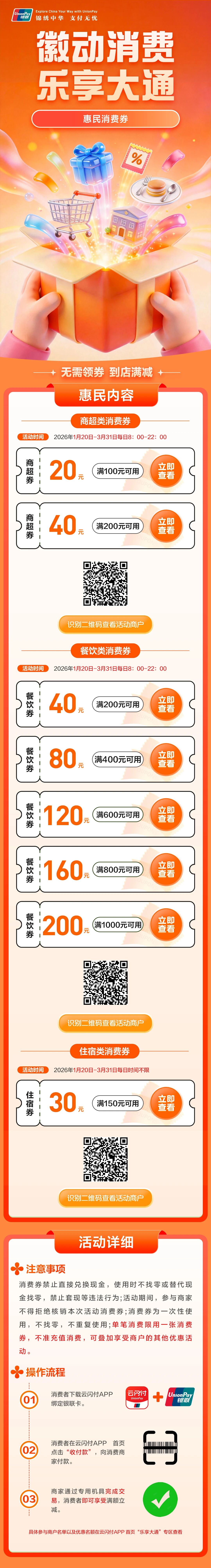 即日起至2026年3月31日商超类消费券满100-20元/满200-40元;餐饮类消费券满200-40元/满400-80元/满600-120元/满800-160元/满1000-200元;住宿类满150-30元。无需领券,到店满减,先到先得。淮南的朋友快打开云闪付APP用起来吧!