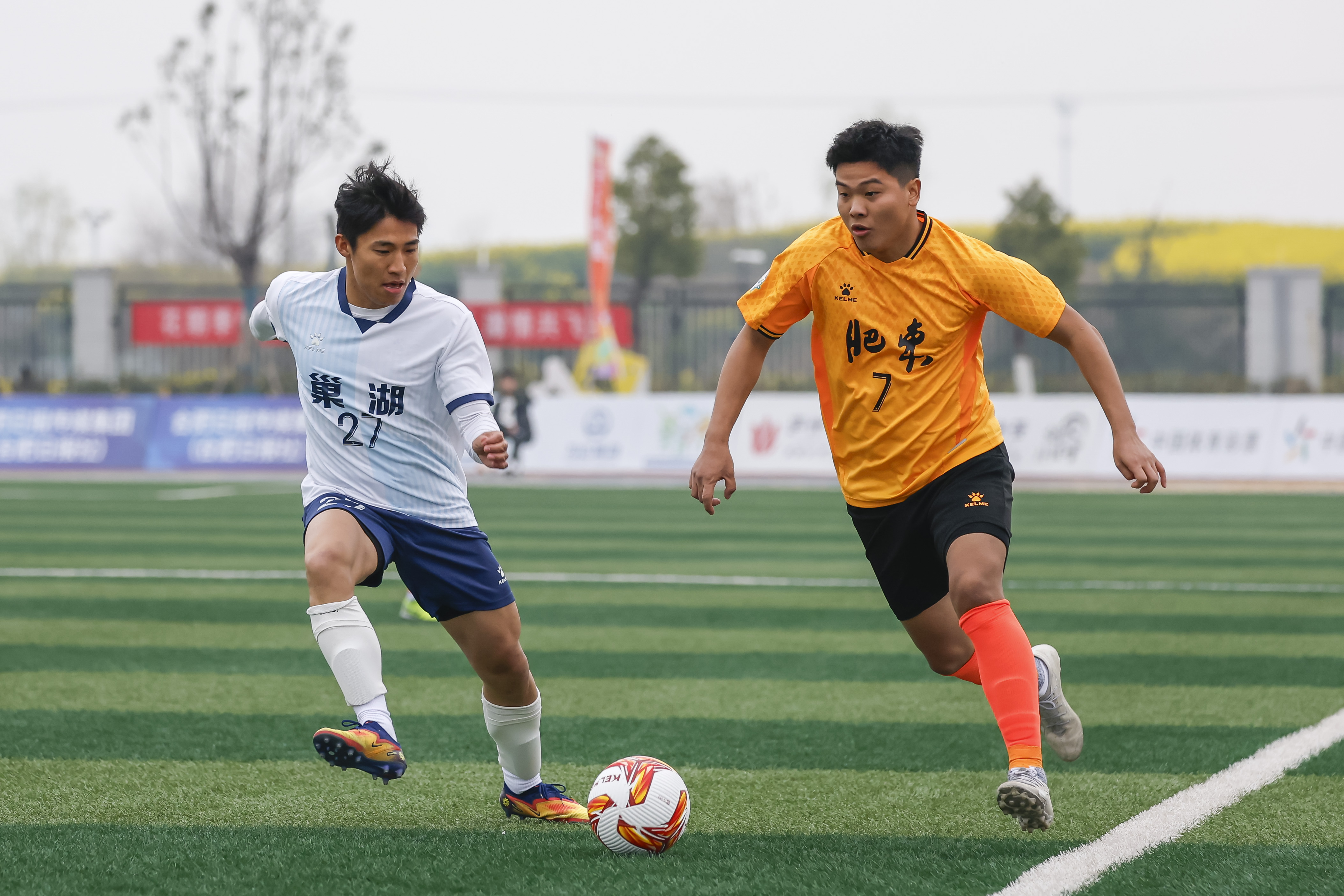 金龙翻腾,瑞狮欢跃。赛前一场精彩的舞龙舞狮表演率先点燃全场气氛。随着主裁判一声哨响,比赛正式打响。双方球员迅速进入状态,传球配合行云流水,过人突破犀利果断,抢断凶狠精准。肥东队凭借主场之利,攻势如潮,频频威胁对方球门;巢湖队则防守严密,反击锐利。射门与扑救的精彩镜头轮番上演,双方你来我往、寸土必争,将现场气氛一次次推向沸点。