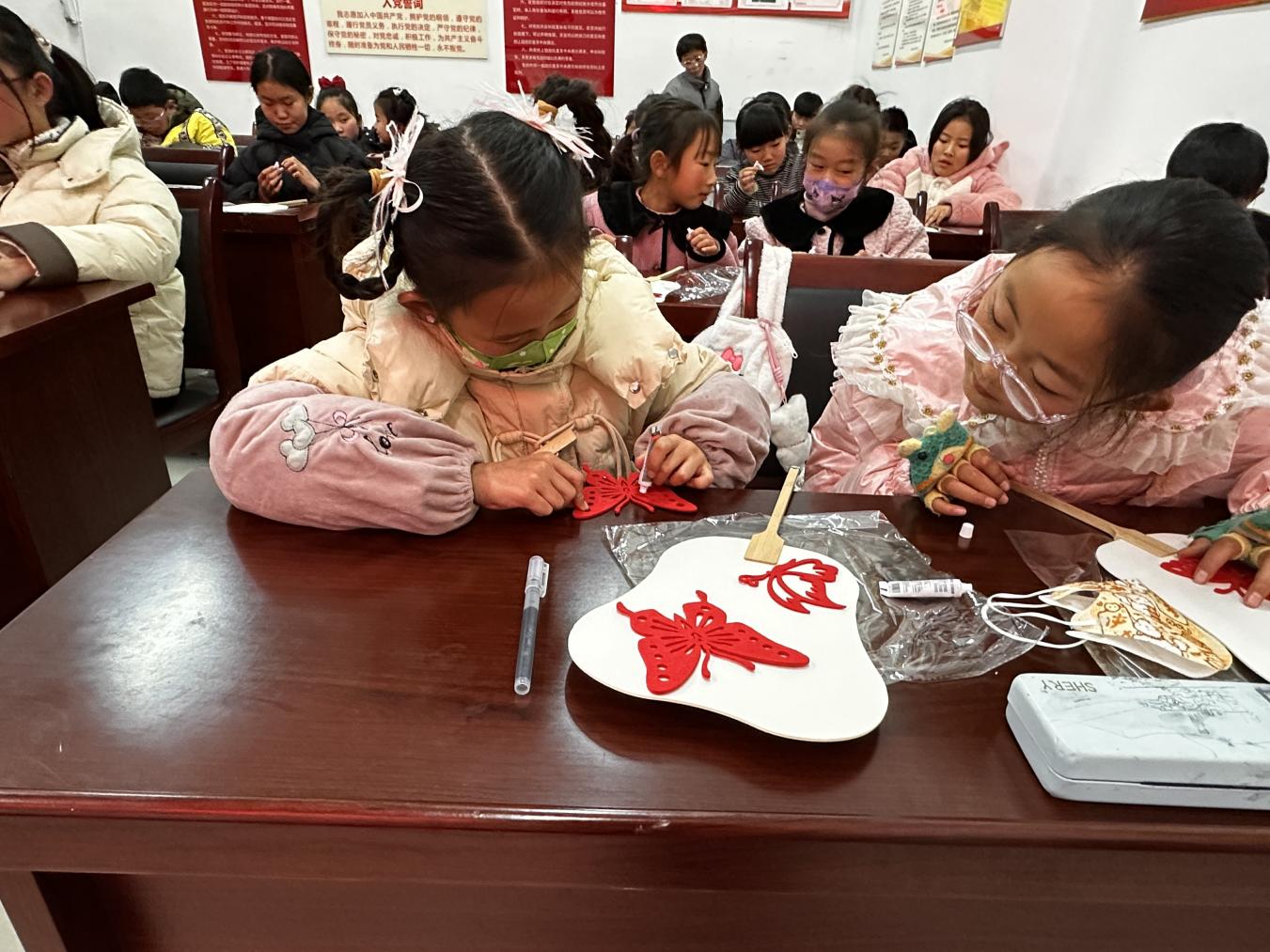 在非遗剪纸团扇DIY环节,孩子们迎来了一场别开生面的传统文化体验。志愿者老师首先为大家介绍了剪纸这一国家级非物质文化遗产的起源、历史和艺术特点,以及团扇所蕴含的团圆友善、吉祥如意的文化寓意。随后,老师手把手指导孩子们进行剪纸创作,从纸张折叠、纹样设计到剪刀运用,每一个步骤都耐心细致。孩子们全神贯注,在剪刀的开合之间,一张张红纸渐渐变成了精美的图案,再将这些剪纸作品精心粘贴到素面团扇上,一把把独一无二的非遗剪纸团扇便诞生了。这个过程不仅锻炼了孩子们的动手能力和创造力,更让他们近距离感受了中华优秀传统文化的独特魅力,文化自信在指尖悄然扎根。
