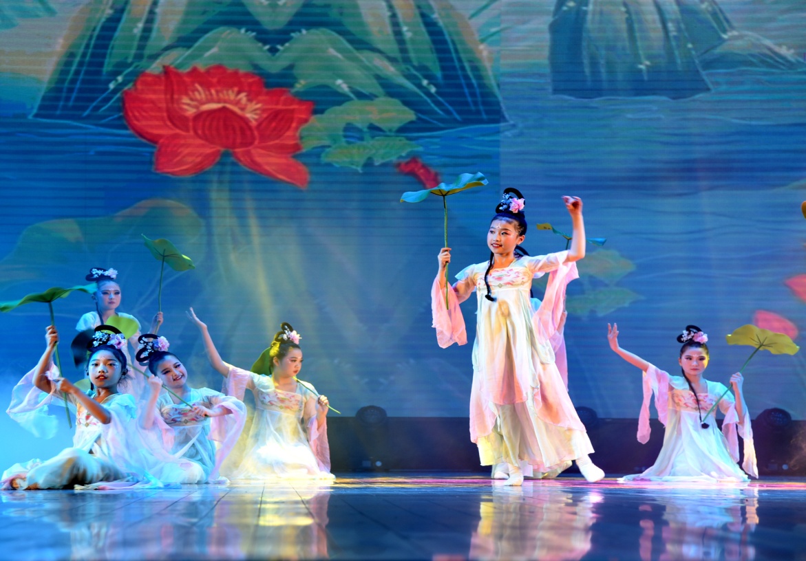 传统文化舞蹈《绣球闹春图》《汉风丽影》《滴答滴答》《江南少女》《鱼戏莲叶间》《荷叶翩翩》等,巧妙将传统民俗元素与现代舞蹈艺术相融合,孩子们身着古典服饰,举手投足间尽显古典韵味,一招一式都传递出中华文化的博大精深与独特魅力。