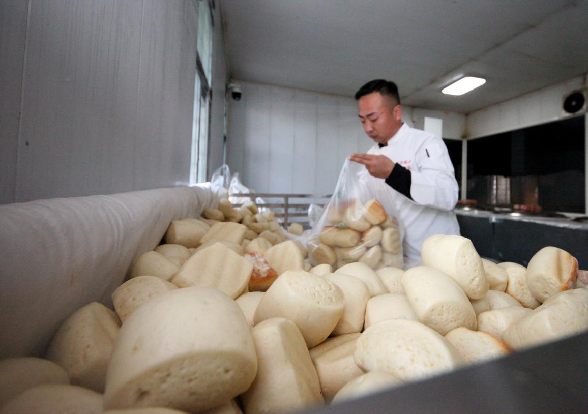 腊八节当日,在淮北市杜集区矿山集街道北山村长寿南山手工地锅大馍生产厂房内,阵阵馍香飘出,村民们加班加点正手工制作地锅大馍。