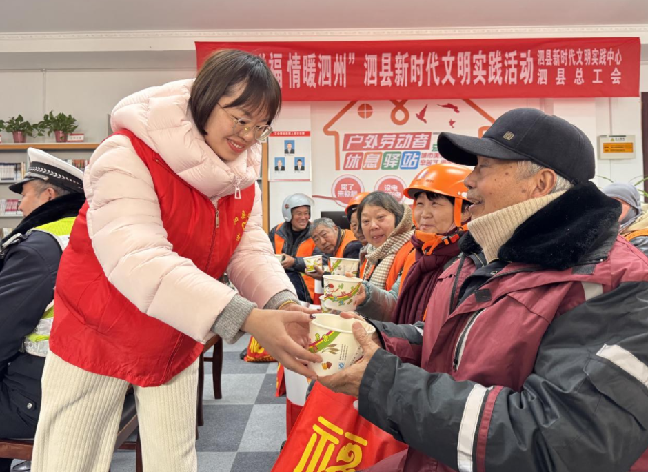 与此同时,泗县总工会设立的烟草公司工会驿站里,外卖骑手张怀飞接过热粥:“跑单间隙能喝上这口热乎的,身上暖和,心里更暖。”环卫工人孙成队连连道谢:“天没亮就出门,这粥真是送到心坎里了。”