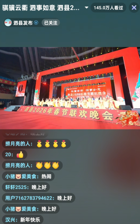 148.3万人观看,不仅是数字的突破,更是泗县探索“数字+文化+乡村振兴”新路径的生动注脚。通过“和美乡村直播间”,泗县将春晚这一传统节庆活动转化为可互动、可分享、可传播的数字文化产品,让文化惠民突破时空限制,让乡村文化在数字时代焕发新活力。