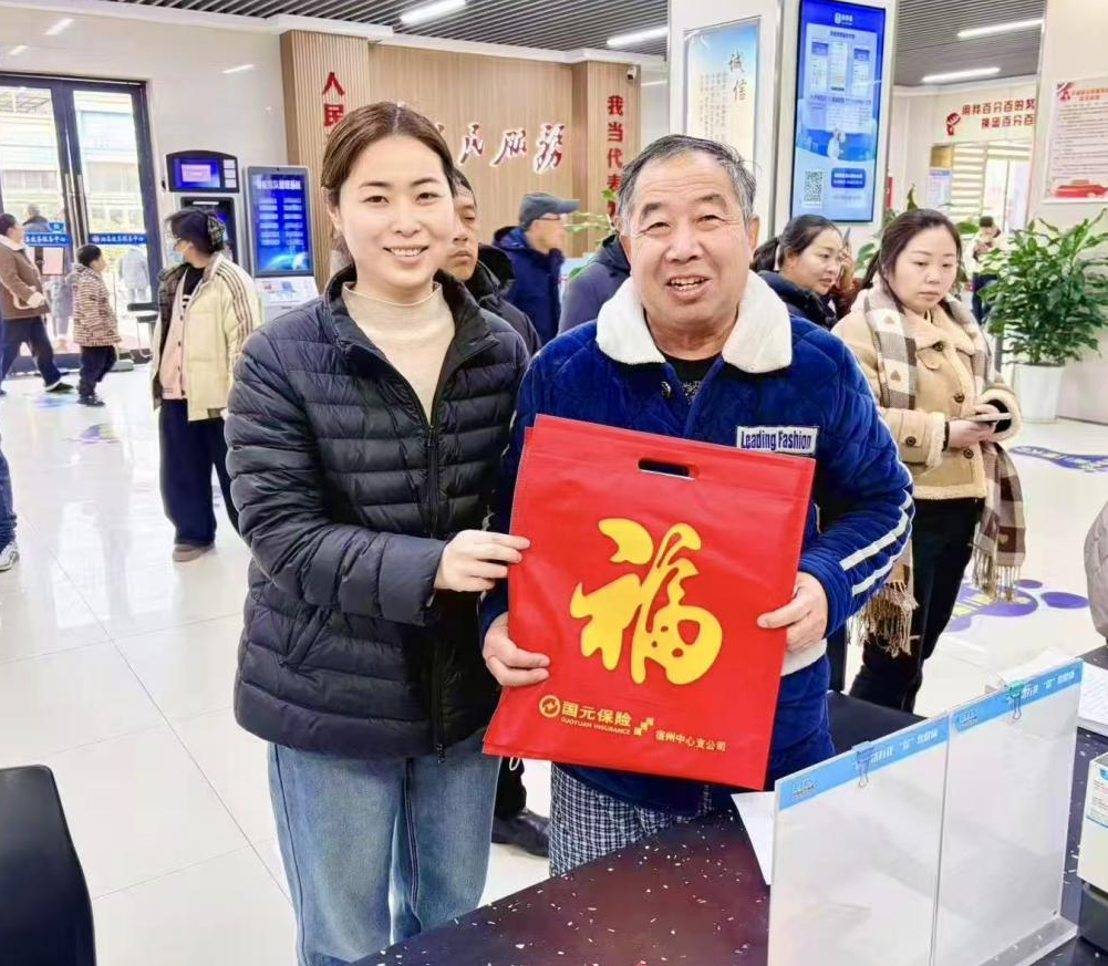 国元保险泗县支公司则通过精心筹备新春暖心大礼包,走进集市、社区、政务服务中心等地,开展集中派送活动。工作人员在送上新春祝福的同时,耐心地向群众讲解农业保险知识,答疑解惑,传递保险为民的服务理念。活动不仅为群众送去节日温暖,也进一步增强了广大农民朋友对保险保障的认识和信任。