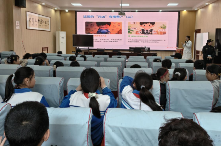 在安全健康科普环节,来自市监、卫健等部门的工作人员通过实物演示、趣味问答等方式,向同学们普及了护眼知识、电子产品合理使用、日常消费安全等内容。工作人员现场展示护眼仪器,指导孩子们科学保护视力,远离近视困扰;结合生动的PPT课件,提醒大家合理控制电子产品使用时间,养成健康的生活习惯,让孩子们在轻松的氛围中掌握了实用的安全健康知识。