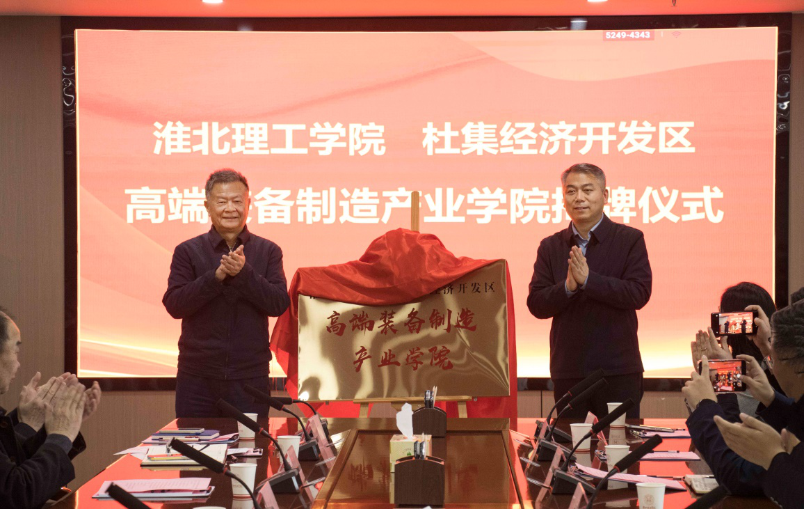 4月3日,淮北理工学院与杜集经济开发区举行理工学院高端装备制造产业学院签约仪式。淮北市政协副主席、杜集区委书记尹农纲,淮北理工学院党委副书记、校长杨兵共同为“高端装备制造产业学院”揭牌。杜集区委副书记、区长魏辉,党委书记、督导专员朱德顺等校地领导,安徽矿机等骨干企业负责人、学院教师和学生代表出席活动。