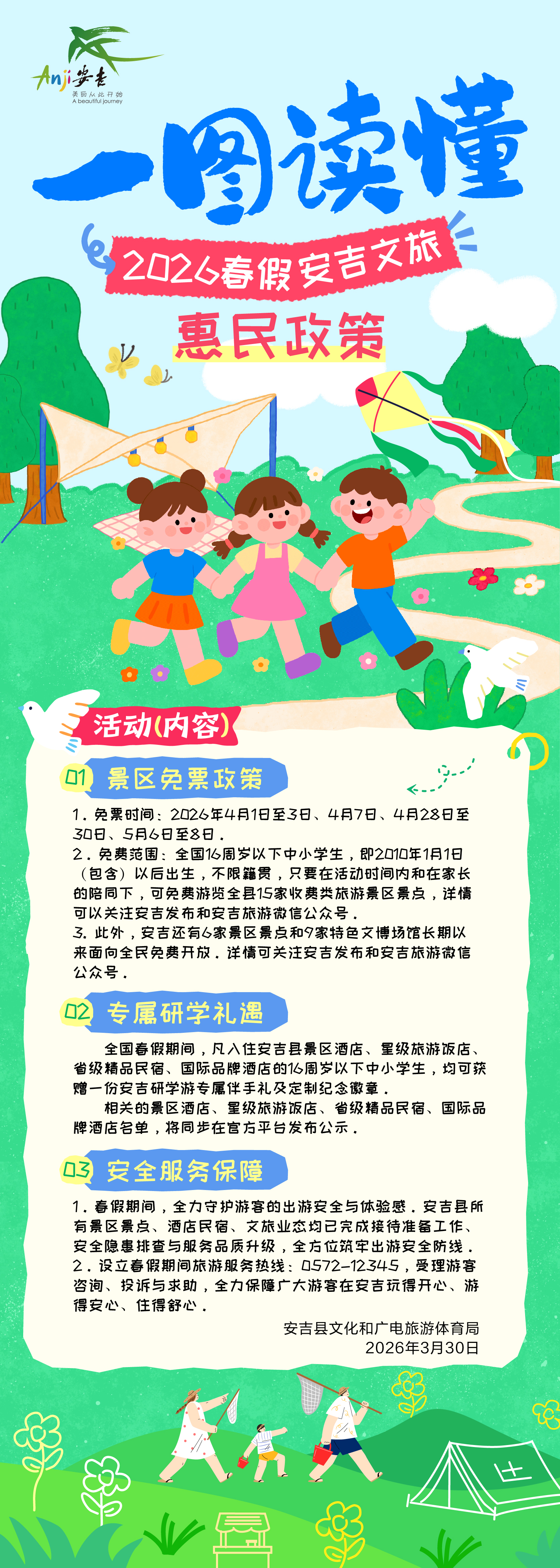 根据发布内容,本次免票政策精准覆盖全国各省市已公布的春假时段,执行时间为2026年4月1日至3日、4月7日、4月28日至30日、5月6日至8日。全国16周岁以下中小学生,即2010年1月1日(包含)以后出生,凭有效身份证件,在活动时间内和在家长陪同下,可免费游览安吉县域内参与活动的15家收费类旅游景区景点,分别是:中国竹子博览园、江南天池景区、浙北大峡谷景区、奇幻嘉乐比景区、云上草原景区、中国大竹海景区、藏龙百瀑景区、灵溪山景区、荣耀天空之城、安吉古城国家考古遗址公园、宋茗茶博园、中国金钱松森林公园、安吉乐那石谷景区、中旅和乐精灵之丘水豚主题乐园、深蓝公园。部分景区景点需家长提前通过OTA平台或景区官方公众号小程序,购买指定春假专属票型或提前预约。此外,安吉还有6家景区景点和9家特色文博场馆长期以来面向全民免费开放。