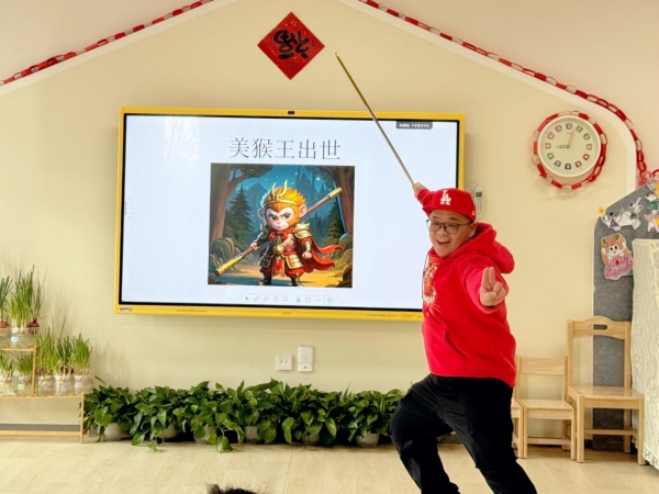 结合中班幼儿活泼好动的年龄特点,安安爸爸设计了趣味十足的金箍棒开场互动。活动伊始,一句亲切的问候、一场炫酷的金箍棒变装,瞬间点燃全场氛围,一扫初次见面的生涩感。
