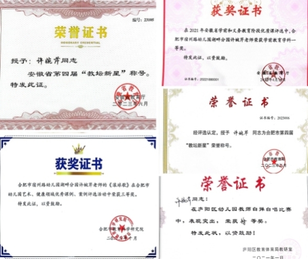 这份对幼教事业的执着深耕,让她在专业道路上硕果累累:先后斩获第四届安徽省“教坛新星”、合肥市“教坛新星”、2021年安徽省学前和义务教育阶段优质课评比一等奖等多项荣誉,更代表合肥市登上“教研江淮行——皖美课堂”的省级舞台。利用业余时间,她积极参与送教下乡活动,将优质教育资源辐射至庐江、瑶海等区域,以实际行动践行宿幼教育集团“理念共享、资源共享”的帮扶初心。