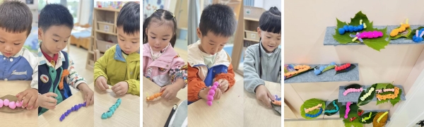 和孩子们交流后发现,大部分孩子都对毛毛虫变蝴蝶充满好奇。小班孩子思维天马行空、偏于抽象,于是我们设计了多样的延伸活动,让孩子们通过粘土、点画等方式大胆创作。让他们自主观察欣赏、探索表达,满足对毛毛虫和蝴蝶的学习兴趣。