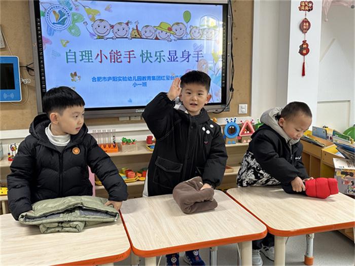 从无助地张开双臂等待帮助,到独立地分辨正反、对准纽扣、拉上拉链——每一次穿衣的尝试,都是自我意识的觉醒。孩子们努力地将胳膊伸进袖口,专注地系上每一个魔术贴,成功后脸上绽放的笑容,是任何赞美都无法比拟的自信光芒。