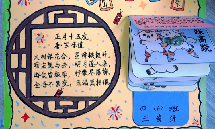 四年级的同学们以“诗画颂元宵”为主题,精心制作图文并茂的元宵诗词小报。小报上,同学们摘抄元宵经典诗词,书写元宵民间故事,描绘家乡元宵特色习俗,搭配精美的插图、工整的字迹,将诗词之美与民俗之韵完美结合。在笔墨书香中,同学们感受着中华传统文化的博大精深,也让元宵民俗在小报创作中得以传递。