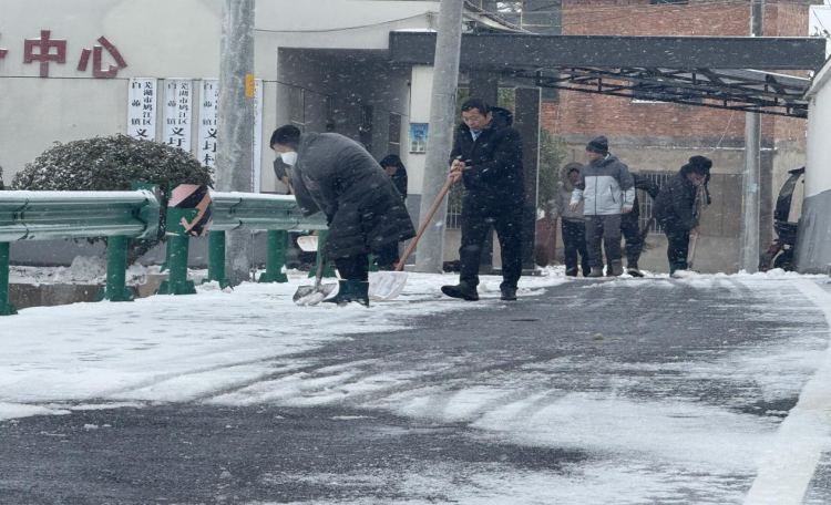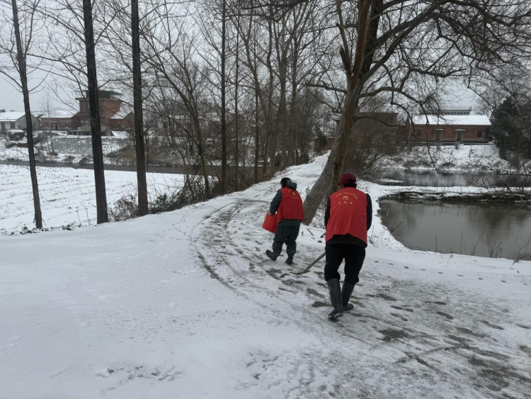 清晨的义圩村寒风刺骨,雪花纷飞,村内主干道上却涌动着热火朝天的劳动热潮。由村“两委”干部带头,党员、“两长”及志愿者组成的“冬季护行志愿队”闻令而动,手持铁锹、竹扫帚迅速集结,全力投入铲雪除冰工作。