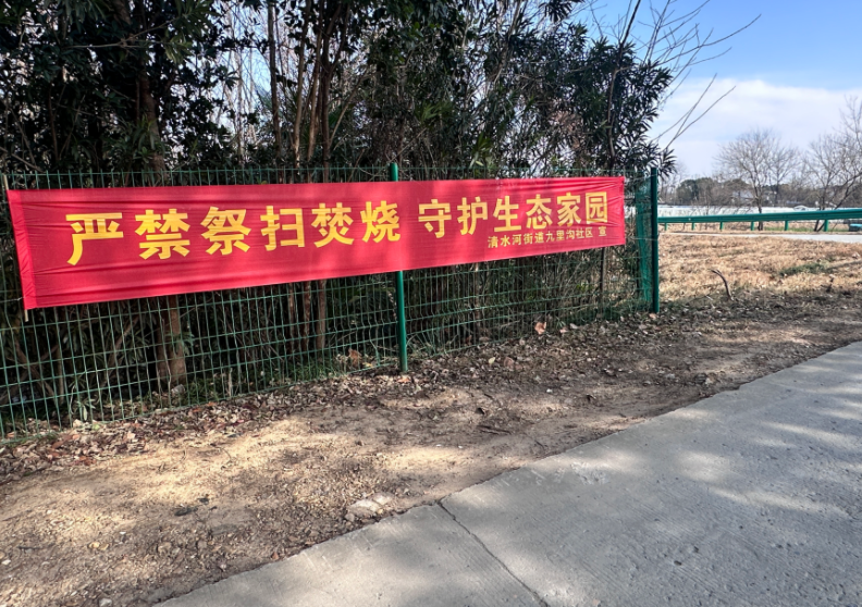 阵地宣传, 红幅映出生态初心。在九里沟老村的道路旁,“严禁祭扫焚烧 守护生态家园”的红色横幅格外醒目,成为冬日里一道亮眼的文明风景线。社区以悬挂横幅、张贴海报等形式,打造沉浸式宣传阵地,让禁烧禁燃、文明祭扫的标语随处可见、入眼入心。这一抹红色,既是社区守护生态环境的坚定决心,也提醒着每一位居民共同筑牢绿色安全防线。