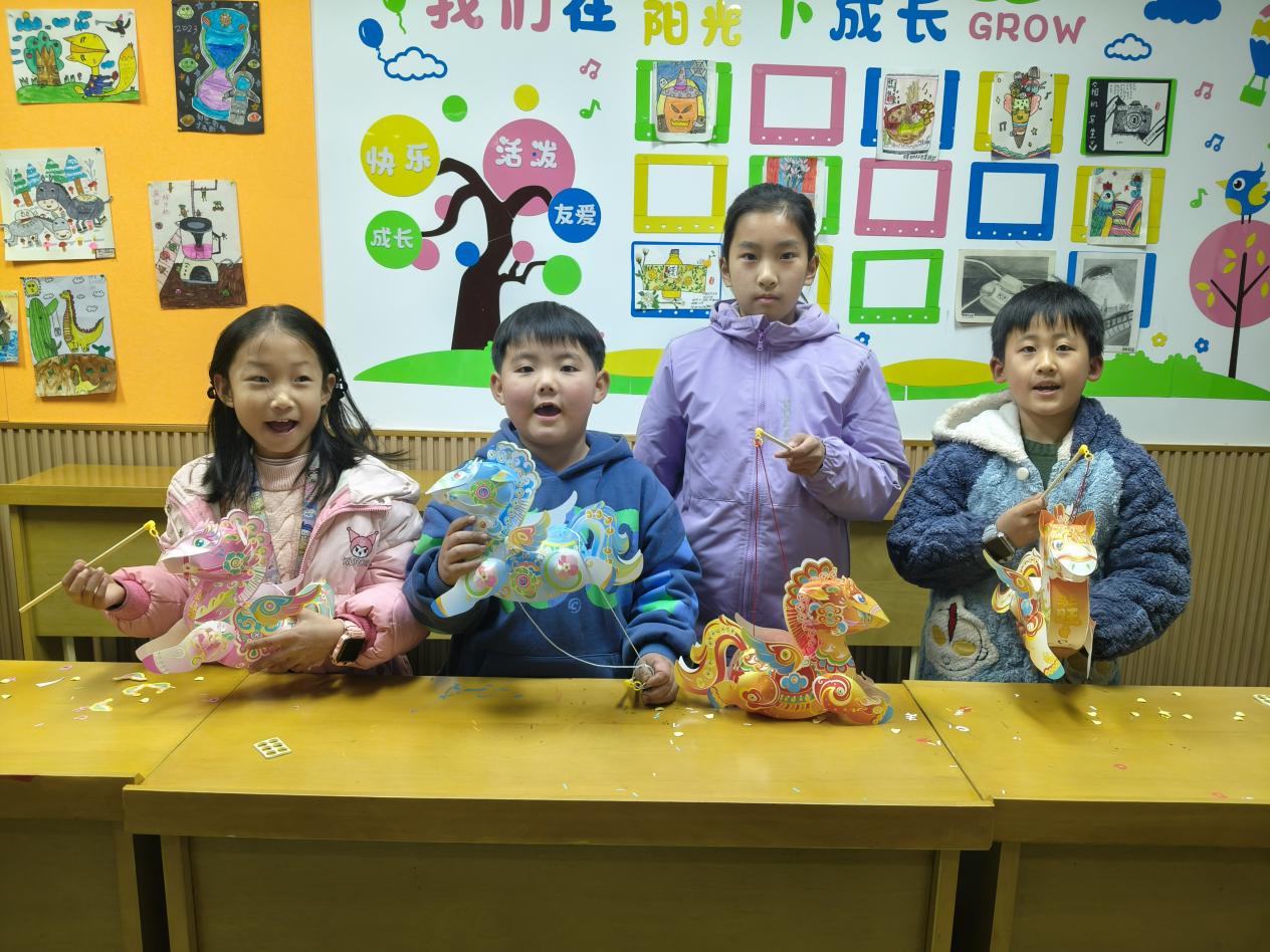 巧手扎灯承古韵,欢歌阵阵启新声。随后开展的“巧手扎马灯·欢歌辞旧岁”活动中,志愿者为孩子们讲述了元旦“辞旧迎新”的文化意义,并生动阐释了马年所承载的“龙马精神”“一马当先”等吉祥寓意。在志愿者与家长的耐心协助下,孩子们亲手扎制马灯骨架、缀饰流苏,一步步完成属于自己的马灯。制作过程不仅锻炼了动手能力,更让孩子们深刻体会到灯笼象征团圆、光明的文化内涵。活动最后,孩子们手提熠熠生辉的马灯,齐唱《新年好》《恭喜恭喜》等歌曲,在温暖灯光与朗朗歌声中,共迎崭新岁月。