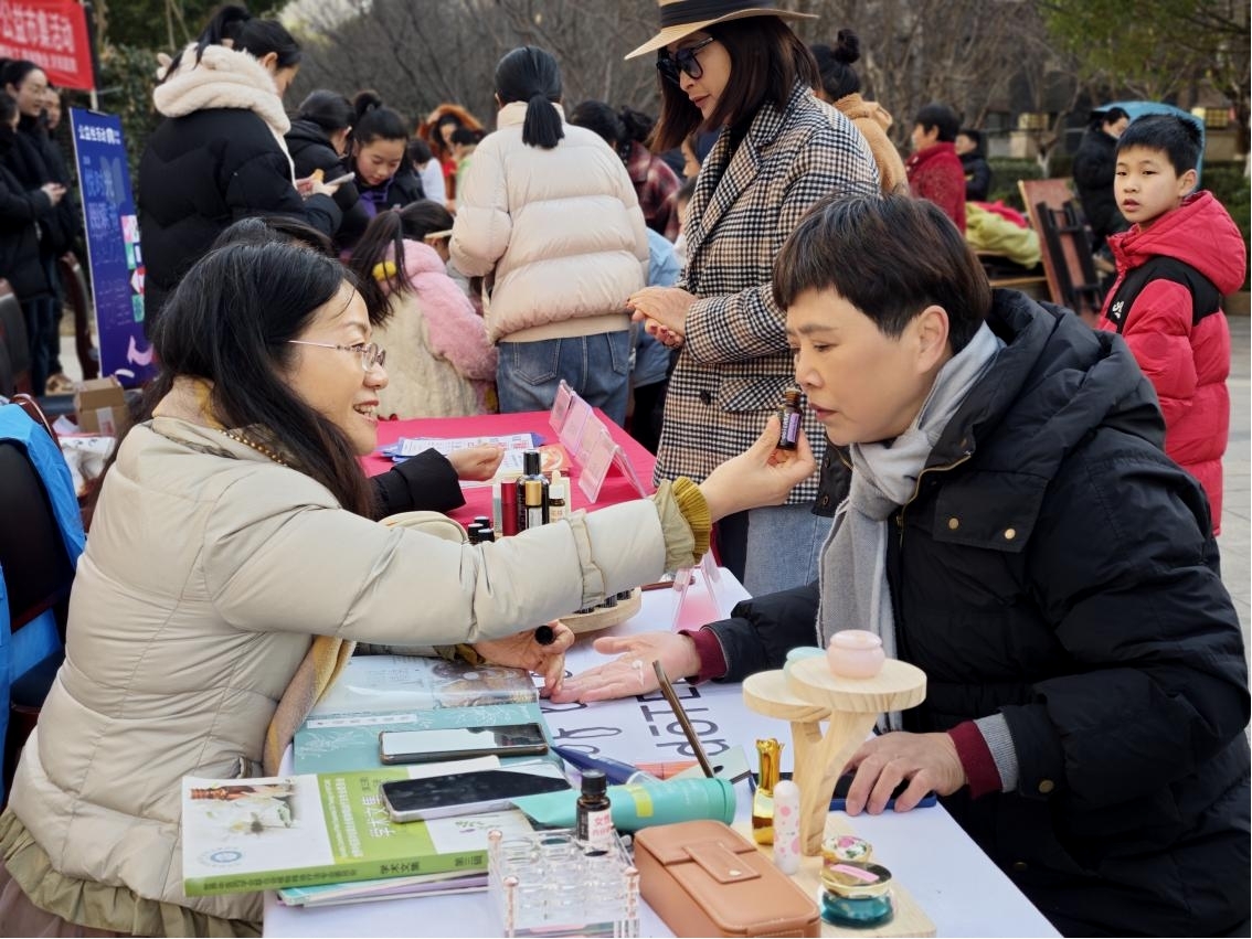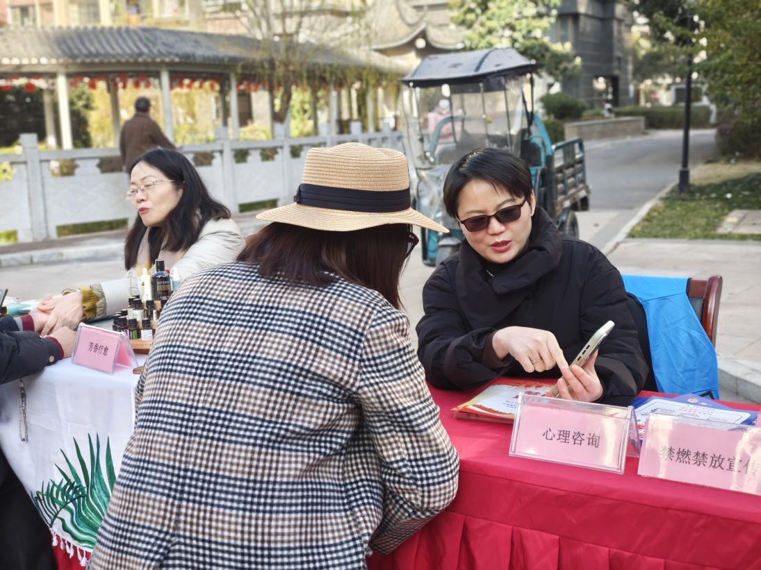 能人出库,市集变身“服务秀场”。活动当天,市集在热气腾腾的腊八粥香中拉开帷幕。与往年不同,今年的公益市集专门设置了“能人咨询台”与“特色体验区”,成为活动最大亮点。这些服务项目的提供者并非外聘专家,而是来自青锋社区“‘五青’网格驿站 助推全龄友好”项目正在积极建设的“青锋达人库”的入库能人。能人咨询台上,社区合伙人们正在为到场居民提供心理健康、家庭教育等免费咨询服务。咨询台的旁边,擅长芳香疗愈的“青锋达人”正引导居民体验精油闻香,而来自“觉浅书堂”的书法达人则手把手教孩子们拓印“福”字,传递年味。