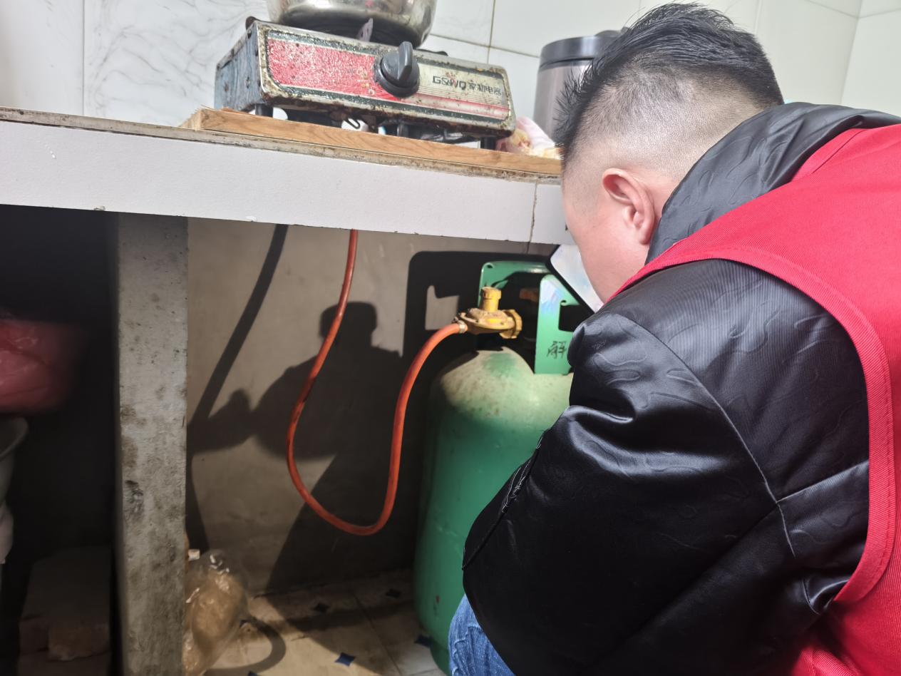 完成沿街商铺排查后,街社工作人员随即深入居民小区,聚焦液化气安全开展入户排查与宣传。工作人员逐户查看液化气钢瓶是否在检验有效期、瓶体有无锈蚀变形、减压阀与连接软管是否老化破损、气瓶是否远离热源明火、通风是否达标,重点关注老年住户、出租户等重点群体。对软管超期、接口松动等问题现场协助整改;对不规范用气行为耐心讲解风险危害,普及燃气泄漏应急处置“先关阀、再通风、禁明火”流程,发放安全用气宣传资料,引导居民养成“勤检查、常更换、规范用”的良好习惯。