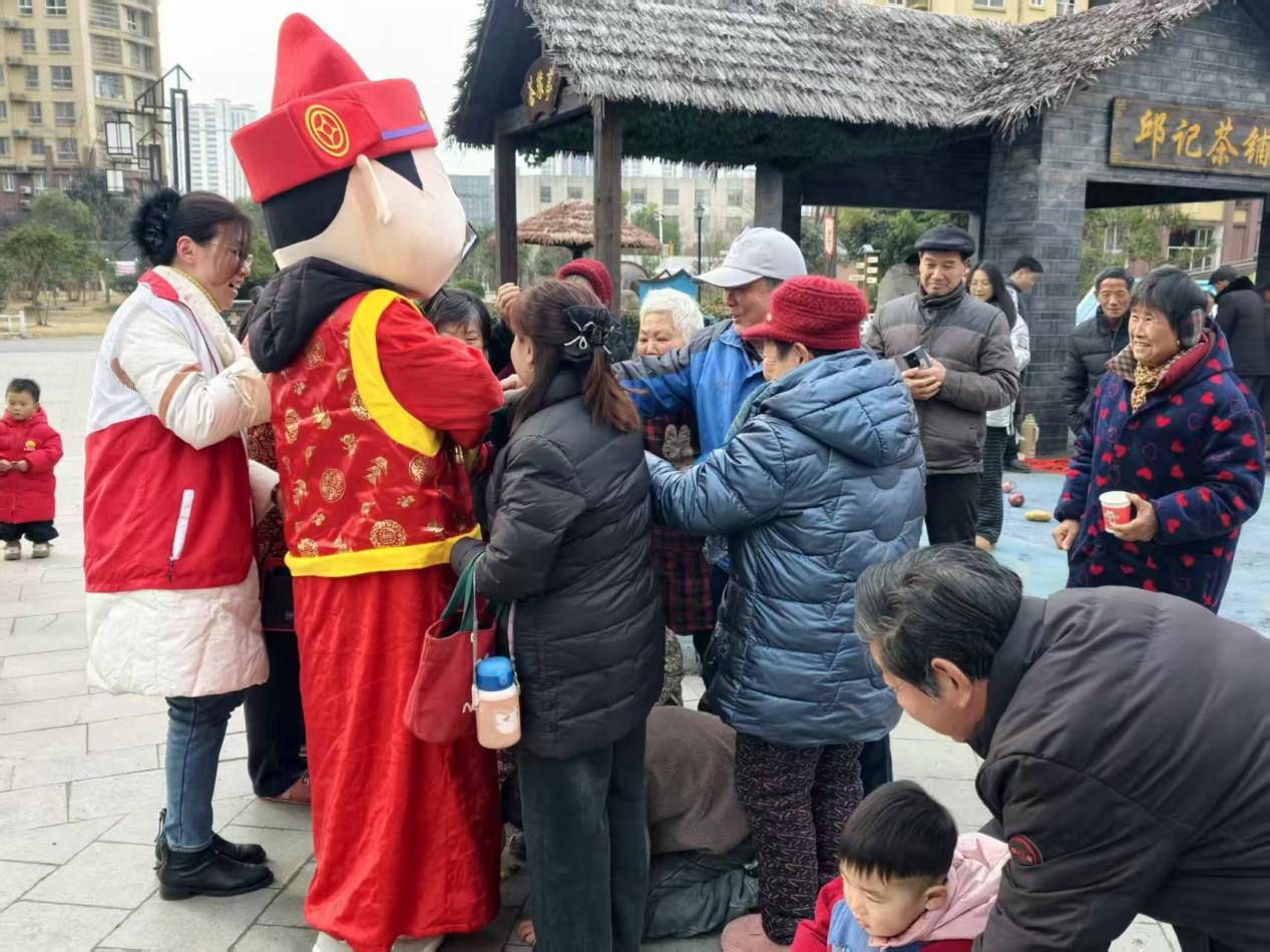 为让居民沉浸式感受新春乐趣,社区还设置了财神送福、趣味套圈等互动环节。志愿者化身“财神”,手持福果穿梭在人群中,为居民派发寓意甜蜜安康的福果,与居民亲切合影留念,传递新春福气与美好祝愿。