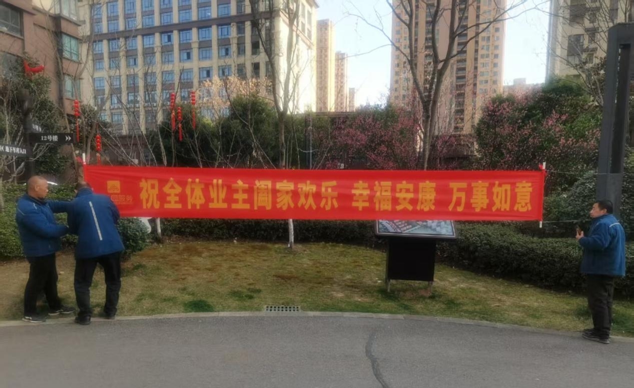 张贴主题横幅,传递新春祝福。物业工作人员在小区主入口、中心广场、各单元楼门口等显眼位置,张贴了多幅设计精美、寓意吉祥的新年主题横幅。横幅以喜庆的红色为底色,搭配金色字体,内容涵盖“阖家欢乐,幸福安康,万事如意”等祝福语,传递了对居民阖家幸福、事业兴旺的美好祝愿,成为小区里一道道亮眼的红色风景线。