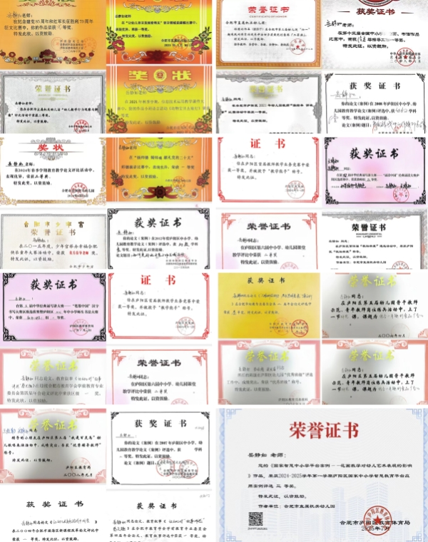 一分耕耘,一分收获。凭借精湛的教学技艺和不懈的努力,岳静如收获了诸多荣誉:2007年获庐阳区教学业务竞赛一等奖,被授予“教学能手”称号;2008年获第十三届中小学生绘画比赛指导工作一等奖;2012年获第六届中小学幼儿园课堂教学评比二等奖;2013年获庐阳区第六届课堂教学评比辅导网特等奖;2021年在庐阳区“党是阳光我是苗”少幼儿书画大赛中获评“优秀辅导教师”;2022年荣获合肥市庐阳区“教坛新星”称号。