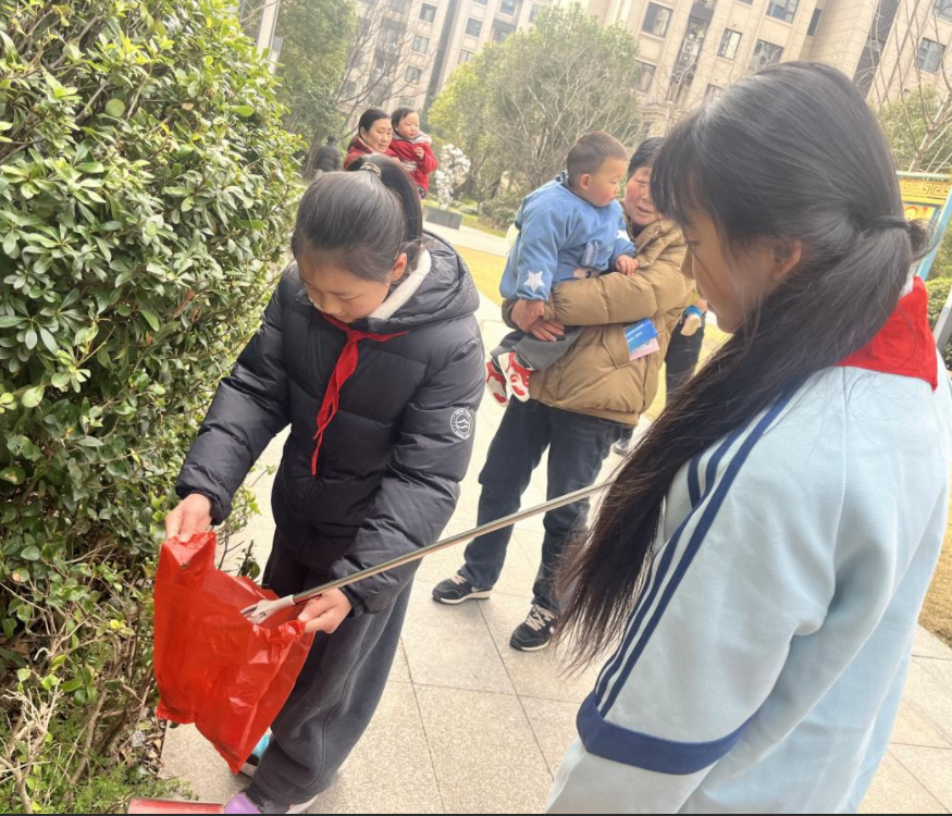 弯腰一秒,争做环保“小卫士”。活动伊始,小志愿者们在社区工作人员和老师的带领下,拿着垃圾钳、垃圾袋,分组来到小区绿化带、健身广场等公共区域,认真捡拾路面和绿化带中的烟头、纸屑、塑料袋等杂物。“这里有烟头!”“草丛里有个饮料瓶!”孩子们三五成群,分工协作,不放过任何一个卫生死角。看到孩子们干得热火朝天,小区保洁阿姨们纷纷竖起大拇指:“这些孩子真懂事,帮了我们大忙!”经过一个多小时的劳动,小区环境变得更加整洁有序。孩子们用实际行动诠释了“不怕脏、不怕累”的雷锋精神,也体会到了保洁阿姨日常工作的辛苦。