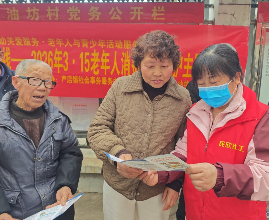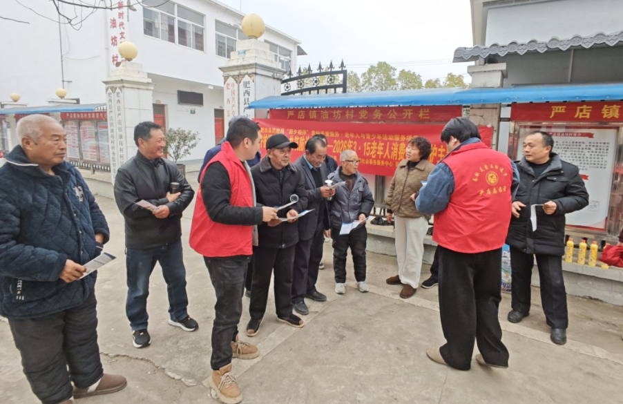 为深入贯彻落实消费者权益保护工作要求,切实维护老年人合法权益,营造安全放心的消费环境,近日,肥西县民政局联合严店镇社会事务服务中心、新时代文明实践所,携手合肥市民欣社会工作服务中心,在严店镇油坊村开展“守护银发消费 共筑防诈防线——2026年3 15老年人消费者权益保护”主题宣传活动。