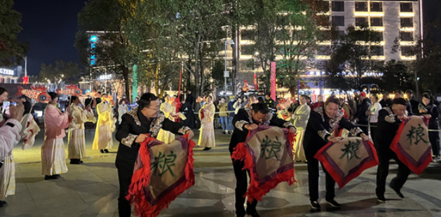 18时58分,民俗表演在承启广场正式开启。由汤口民宿联盟成员组成的表演队伍,将徽州传统民俗精髓融入表演,还原了古徽州婚嫁“踩粮袋”的经典场景:前一人铺粮袋,后一人紧接而上,步步相承的动作,将“传粮”与“传良”的谐音寓意生动演绎,让现场观众直观领会民俗背后的深意。