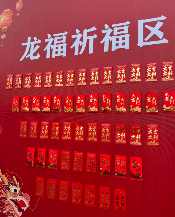 祈福纳祥迎好运,喜气洋洋过大节。龙福祈福区特设趣味红包墙和民俗打卡点,群众转发活动现场照片至朋友圈或抖音平台,集满8个赞即可参与红包抽取活动,福袋、红包内包含各类实用好礼,承载着浓浓的新春祝福与美好祈愿。志愿者们细心核验参与资格、协助抽取红包、引导拍照打卡,让全年龄段群众都能沉浸式体验民俗祈福的乐趣,接住新年第一波好运。此次活动特意筹备红包墙55个、候补红包25个,全力保障每位参与者都能收获惊喜。