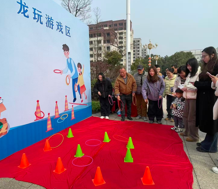 趣味互动添欢乐,民俗体验更尽兴。套圈游戏区人气爆棚、欢声笑语不断,志愿者们提前划定游戏区域、明确游戏规则、有序维护现场秩序,群众们屏息凝神、精准投掷,套中奖品即可兑换龙食区抵用券,沉浸式感受民俗游戏的乐趣。趣味互动环节不仅提升了活动的参与性和趣味性,更搭建了老少同乐、邻里欢聚的平台,让传统民俗节俗真正融入群众生活。