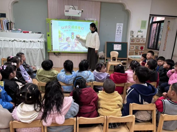 小班以交通安全为主题,教师借助卡通信号灯、交通标志教具,用浅显语言引导幼儿认识红绿黄灯含义与基础交通规则。为加深记忆,老师们还带领幼儿学习交通安全手指谣,通过儿歌律动的趣味形式,让孩子们在轻松氛围中牢记出行安全常识,树立初步交通规则意识。