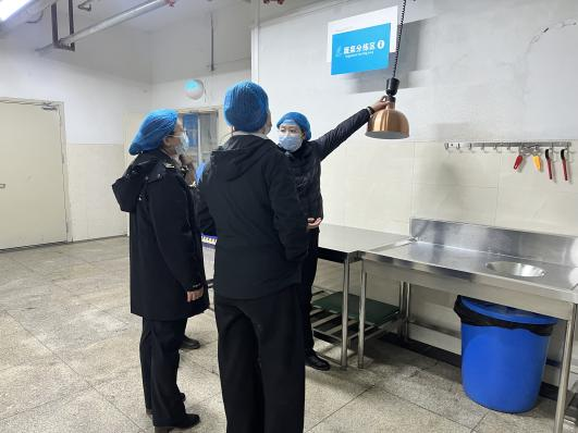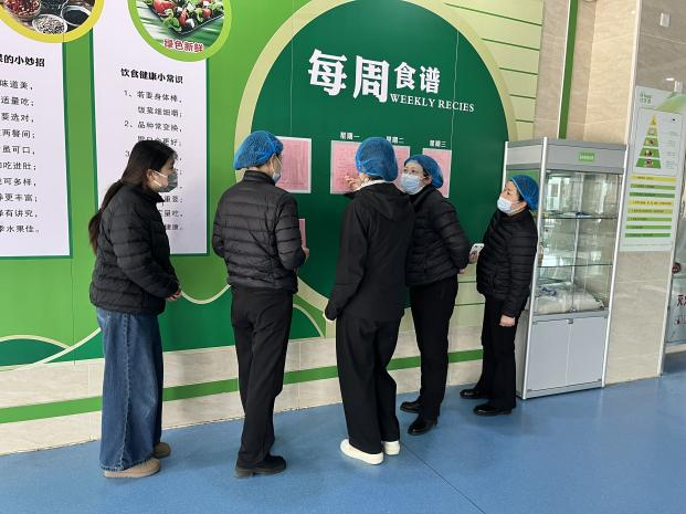在食堂检查现场,检查组严格对照校园食品安全 “红黄绿牌”评榜标准,聚焦食材采购索证索票、储存分区管理、餐具消毒流程、食品留样规范等关键环节,对后厨环境卫生、烹饪操作规范、从业人员健康管理等情况进行全链条细致核查。庐阳实验小学党支部书记、校长叶佳,副校长王菁,办公室王健中副主任,总务处王培君副主任、阮波副主任及食堂经理全程陪同检查,就学校食品安全管理制度、常态化自查机制等情况作详细汇报。检查组对学校将食品安全纳入 “985”工作体系中 “8 项保护”范畴、构建家校社协同监管机制的做法给予肯定,认为学校食品安全管理规范有序、责任落实到位。