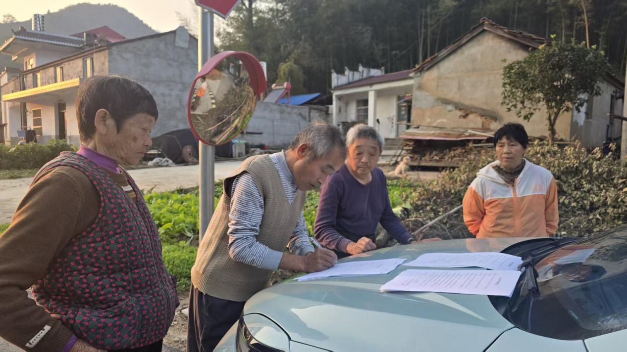 这话说到了两家的心坎里。在村干部的劝说下,原本剑拔弩张的双方松了口,同意各退一步。为了趁热打铁敲定结果,大家干脆把旁边汽车的引擎盖当“临时办公桌”,现场拟好调解协议,两位村民当场签字确认,一场僵持的地界纠纷,就在村道旁的暮色里圆满化解。