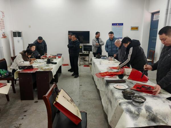 活动现场暖意融融、墨香四溢。美术家协会的作家们不顾辛劳,刚一落座便迅速投入状态,展纸、研墨、提笔,一系列动作娴熟流畅。他们凝神聚力,笔走龙蛇,或楷书端庄大气,或行书飘逸洒脱,或隶书古朴厚重,一幅幅寓意吉祥的春联、一张张饱含祝福的“福”字、一幅幅雅致生动的画作在笔尖跃然纸上,既有“福暖四季、寿比南山”的美好祈愿,也有描绘田园风光、花鸟景致的雅致佳作,每一笔、每一划都承载着对老人们健康长寿、幸福安康的深切祝福,也展现了萧县书画艺术的独特魅力。