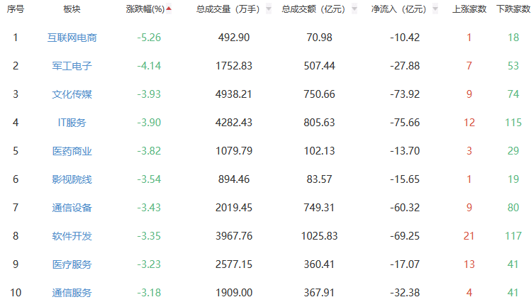 行业板块方面,贵金属、能源金属、农化制品等板块涨幅居前,互联网电商、军工电子、文化传媒等板块跌幅居前。