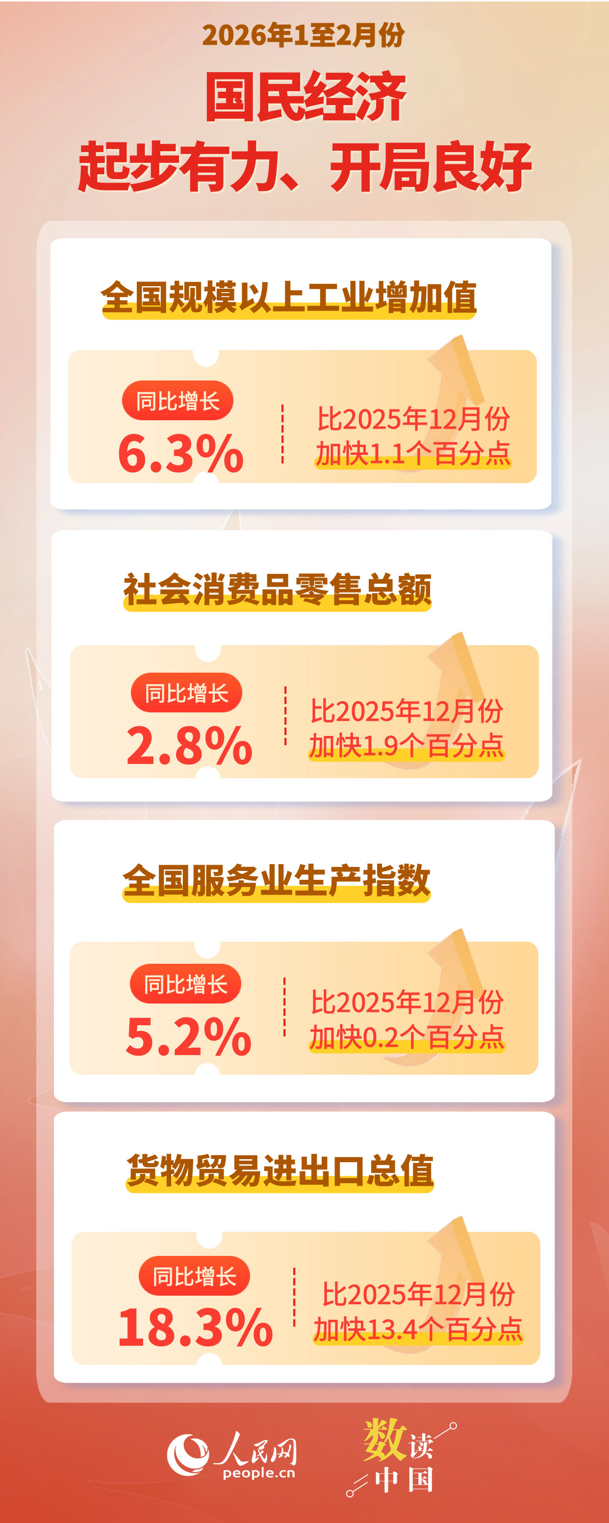1—2月份,全国规模以上工业增加值同比增长6.3%,比上年12月份加快1.1个百分点。分三大门类看,采矿业增加值同比增长6.1%,制造业增长6.6%,电力、热力、燃气及水生产和供应业增长4.7%。装备制造业增加值同比增长9.3%,高技术制造业增加值增长13.1%,分别快于全部规模以上工业增加值3.0和6.8个百分点。分经济类型看,国有控股企业增加值同比增长4.2%;股份制企业增长6.9%,外商及港澳台投资企业增长4.0%;私营企业增长7.4%。分产品看,3D打印设备、锂离子电池、工业机器人产品产量同比分别增长54.1%、42.6%、31.1%。从环比看,2月份规模以上工业增加值比上月增长0.83%。2月份,制造业采购经理指数为49.0%;企业生产经营活动预期指数为53.2%,比上月上升0.6个百分点。