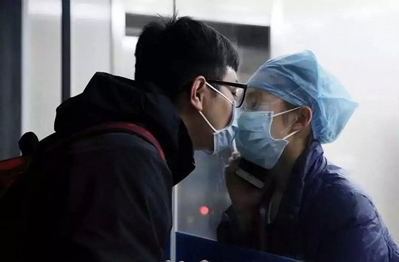 隔着玻璃戴着口罩亲吻