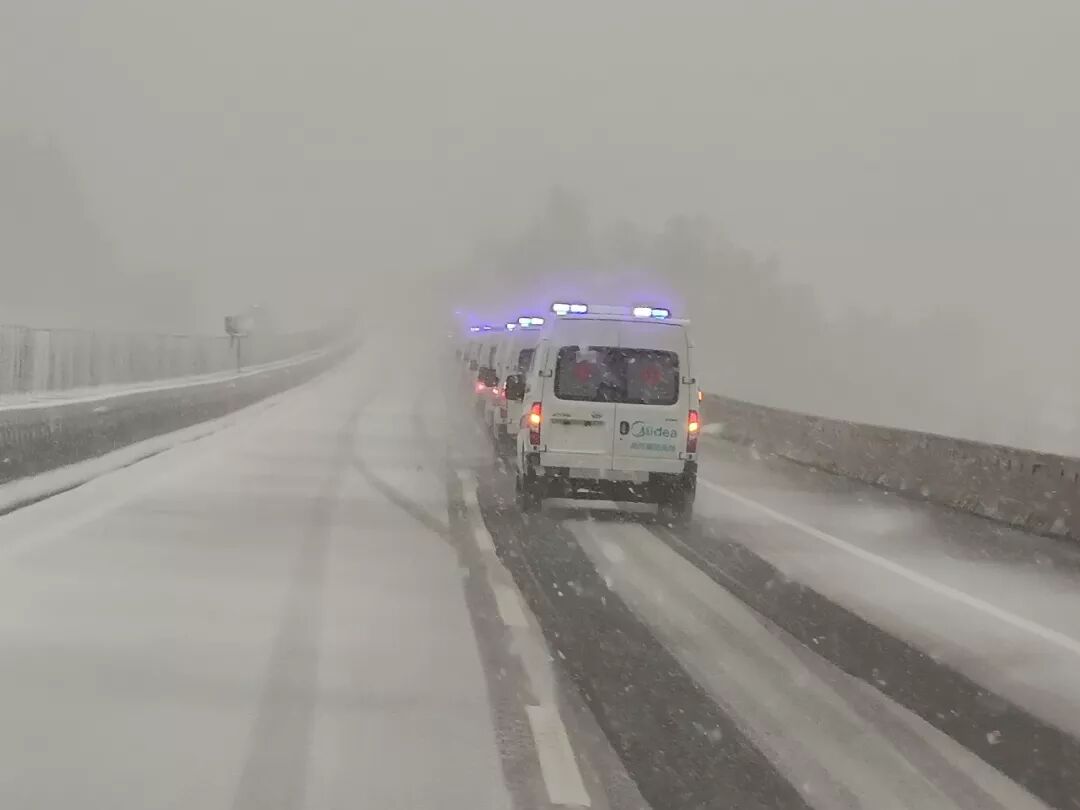 车辆越往西气温就越低,雨水渐渐变成了雪粒子、小雪、大雪,等行至大别山腹地时,高速路上已被雪覆盖,大雪纷纷,群山染白,除了对讲机里不时传来领队的声音:“雪天路滑,大家注意保持车距,安全第一”。周边安静得似乎只剩雪落下的声音,恶劣的天气使路途变得犹为漫长。
