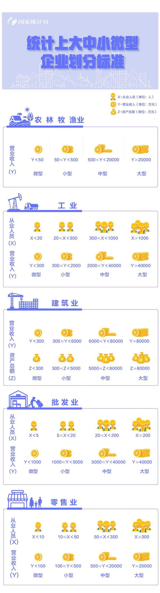 该办法按照行业门类、大类、中类和组合类别,依据从业人员、营业收入、资产总额等指标或替代指标,将我国的企业划分为大型、中型、小型、微型等四种类型。