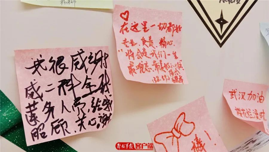 隔离病区一面墙壁上,“生长”了一棵褐色的“树干”。从最初光秃秃的“枝干”开始,随着医务人员和患者的不断加入,在“枝干”上不断生长出一片片绿色、蓝色、红色、黄色小“树叶”。在这里没有相同的两片“树叶”,每片“叶子”上面都有着不同的留言,大家路过时都会驻足品味每条留言,或拿起纸笔添上一片“树叶”。
