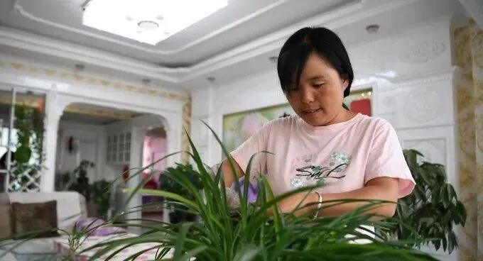 △在甘肃临夏回族自治州临夏县土桥镇易地扶贫搬迁安置点,搬迁户杨喜梅在家中收拾家务。