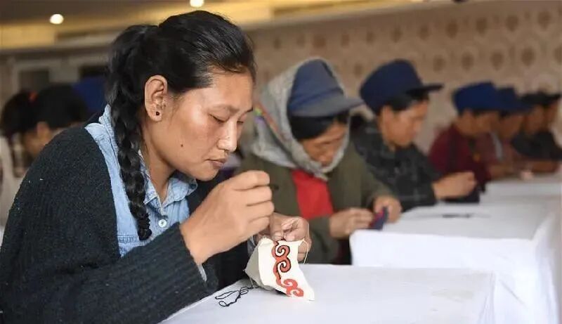 △四川省凉山彝族自治州布拖县依撒社区的妇女们在县妇联组织的彝绣培训班上学习彝绣。