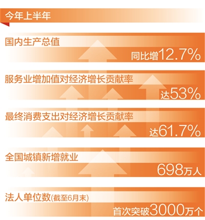 结构优化,效益提升,经济内生动力持续增强。上半年服务业增加值对经济增长的贡献率达到53%,比一季度提高2.1个百分点;最终消费支出对经济增长的贡献率达到61.7%。1—5月份,规模以上工业企业利润总额同比增长83.4%,企业盈利增强。